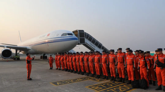 使馆表示,当地时间3月29日16时许,中国政府派遣的救援队一行82人携带20余吨通信、搜救、医疗设备和应急食品等应急救援物资,自北京千里奔袭抵达仰光国际机场。