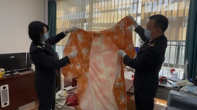 经开箱查验,这批货物为旧和服,共840件,颜色、规格等各不相同,使用痕迹明显,味道刺鼻,布料上有污渍及霉点。目前,该关已对这批旧衣物作暂不予放行处理。