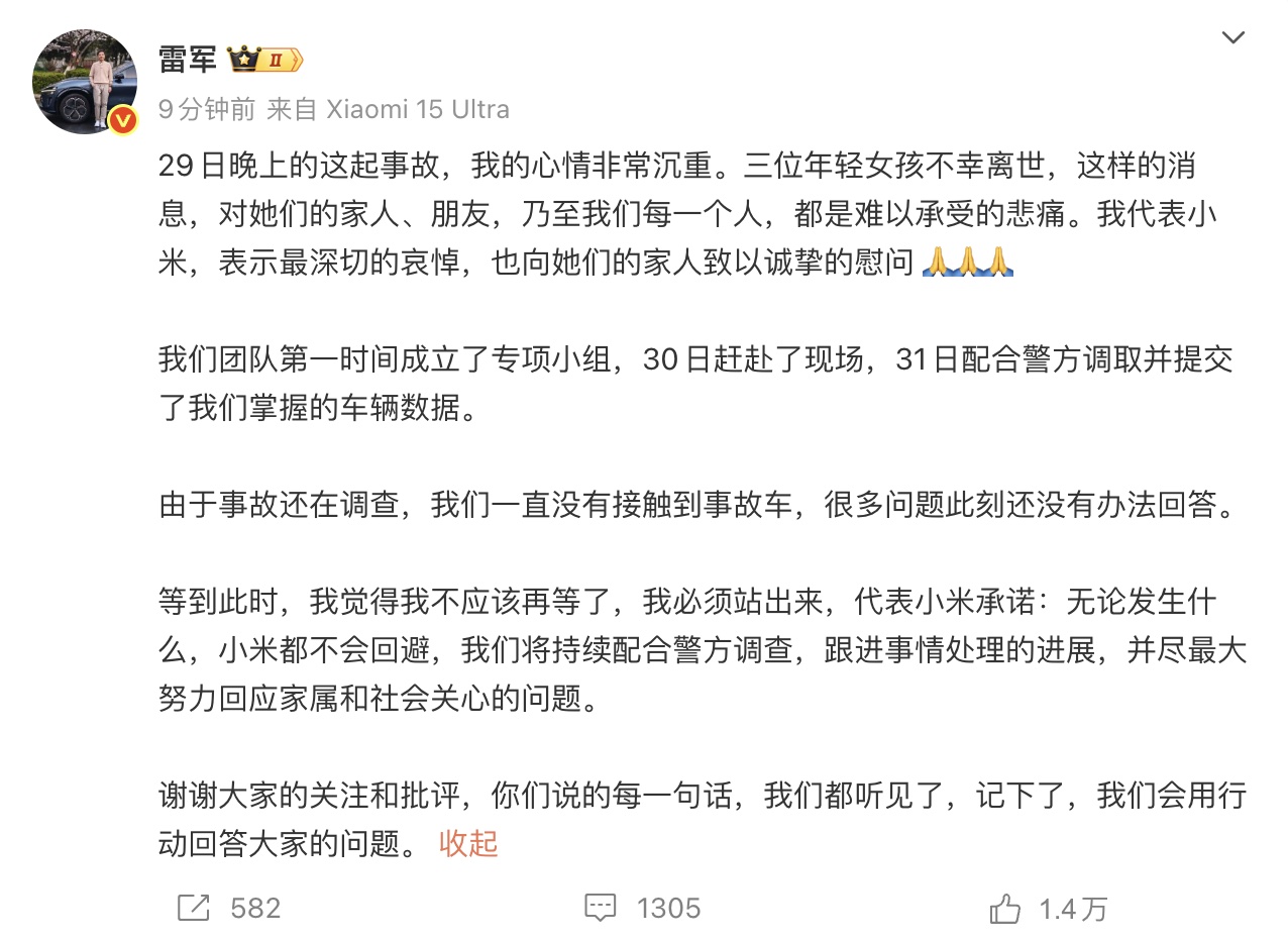 4月1日晚,雷军发文回应小米SU7车祸,内容如下: