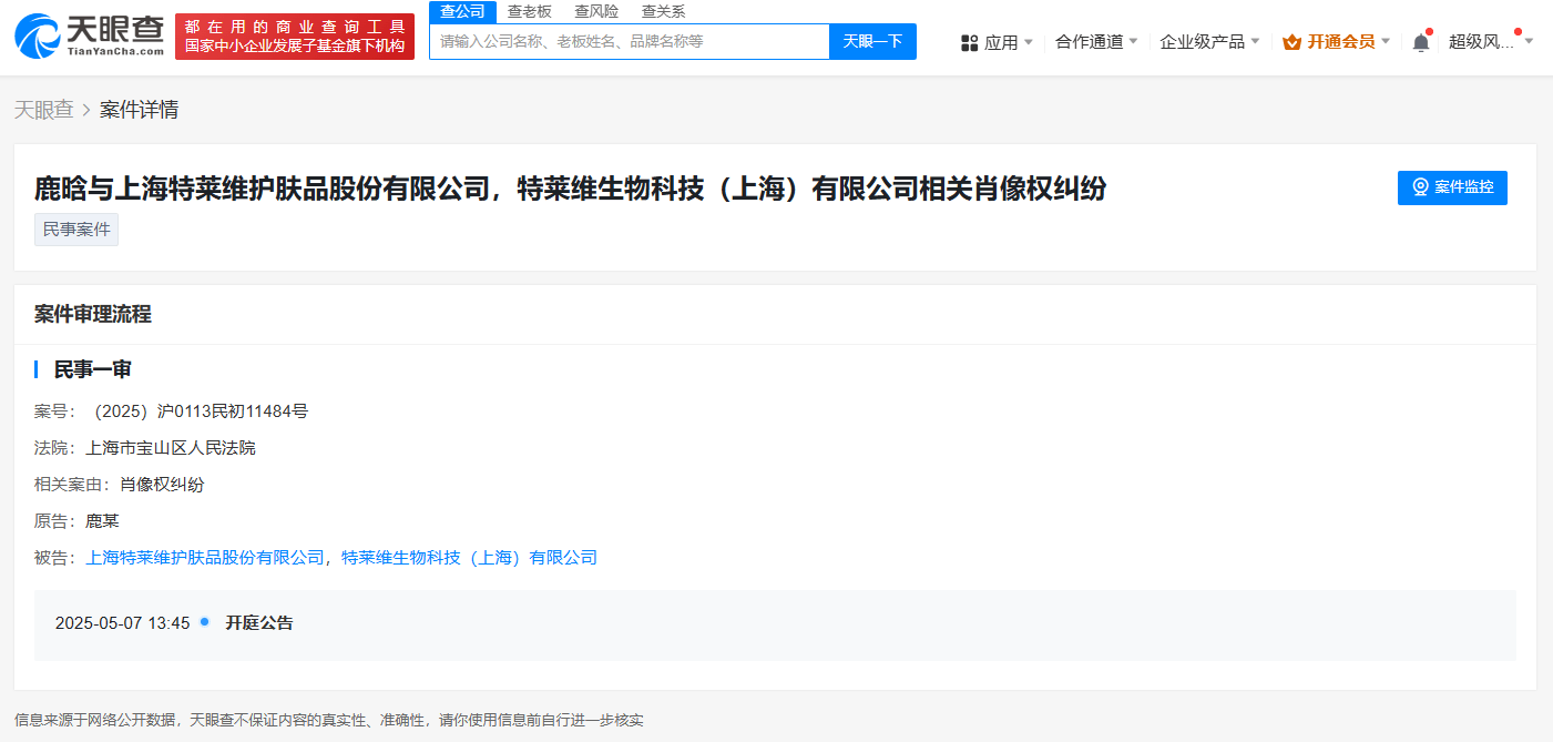 搜狐娱乐讯 4月16日,天眼查App显示,近日,鹿晗与上海特莱维护肤品股份有限公司、特莱维生物科技(上海)有限公司相关肖像权纠纷案件新增开庭公告,原告为鹿晗,该案将于5月7日在上海市宝山区人民法院开庭审理。