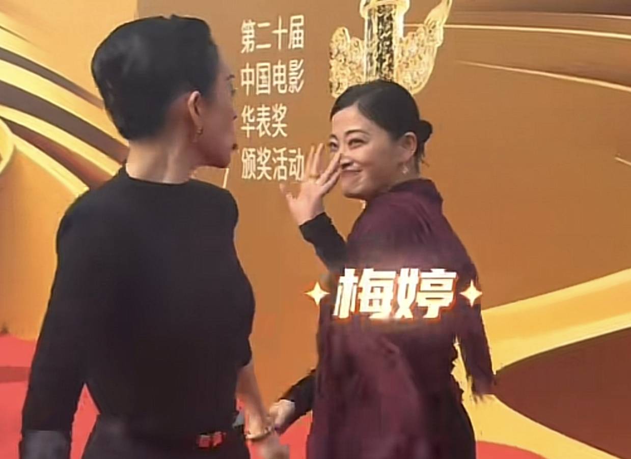 作为曾经的华表奖的得奖者,章子怡身穿黑色礼服利落亮相,只是对着镜头才露出冷峻的气场,转脸就对着红毯笑成了花,看着迎面走来的梅婷,她隔着老远就伸出手示好,追问着对方是不是已经走过红毯。