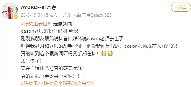 19日,陈奕迅爱徒、《中国新歌声》学员叶晓粤通过微信联系其助手,确认“假新闻”,并愤怒发声:“现在自媒体造谣真的毫无底线!真的恶心至极其心可诛!” 其微博迅速冲上热搜第一,评论区涌入数万条“终于能安心睡觉”的粉丝留言。