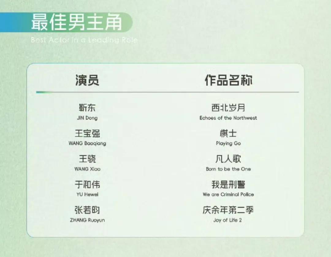 入围最佳男主角的则分别是《西北岁月》靳东、《棋士》王宝强、《凡人歌》王骁、《我是刑警》于和伟和《庆余年2》张若昀。