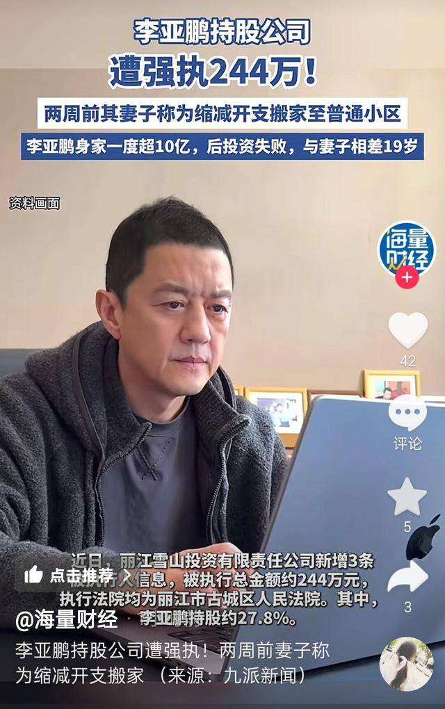 近日,李亚鹏财务方面又出问题了,据多家权威媒体报道,李亚鹏持股公司遭强制执行244万。虽说这个金额并不大,但在这敏感时期,对于李亚鹏来说无疑是雪上加霜。