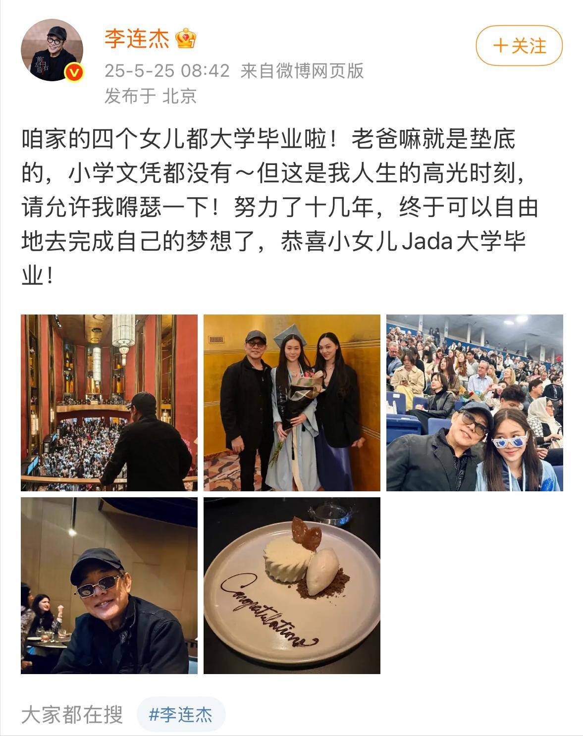 他发布了一组小女儿毕业典礼的现场照片,三女儿Jane Li也参加了。