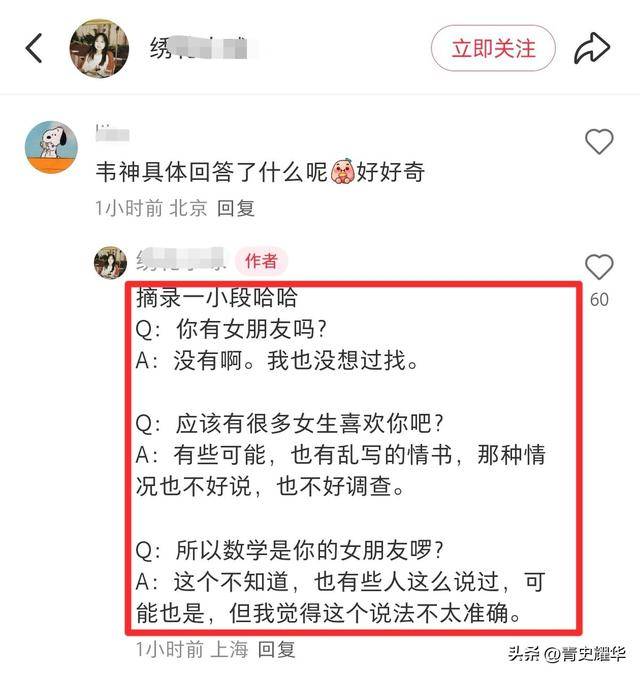 据记者所说,采访韦神时,他几乎全程背对着记者,在采访中,韦神还明确说过,自己没有女朋友,也并不准备找女朋友,他更感兴趣的还是数学。