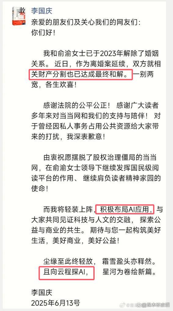 据了解,李国庆与前妻俞渝的婚姻早在2023年已经解除了法律关系,但在此后的两年里,两人一直就财产分割问题在打官司。如今,李国庆表示,双方已就财产问题达成了最终和解。
