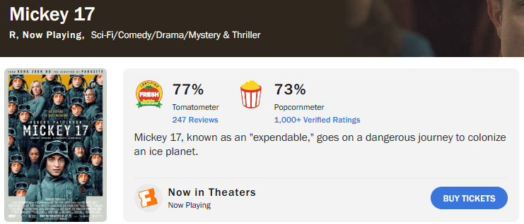不过不同于《寄生虫》的风光无限,这部奉俊昊导演生涯中制作规格最高、且掌握了最终剪辑权的“闯好莱坞”大片,目前来看绝对算不上成功——烂番茄新鲜度77%,Letterboxd评分3.7/5,豆瓣评分7.2,媒体和影迷的评价充其量只能算“良”等;而仅为B的Cinemascore评级、73%的烂番茄“爆米花指数”和6.1的MTC观众均分,则证明《编号17》在普通观众中的反响相当不妙。