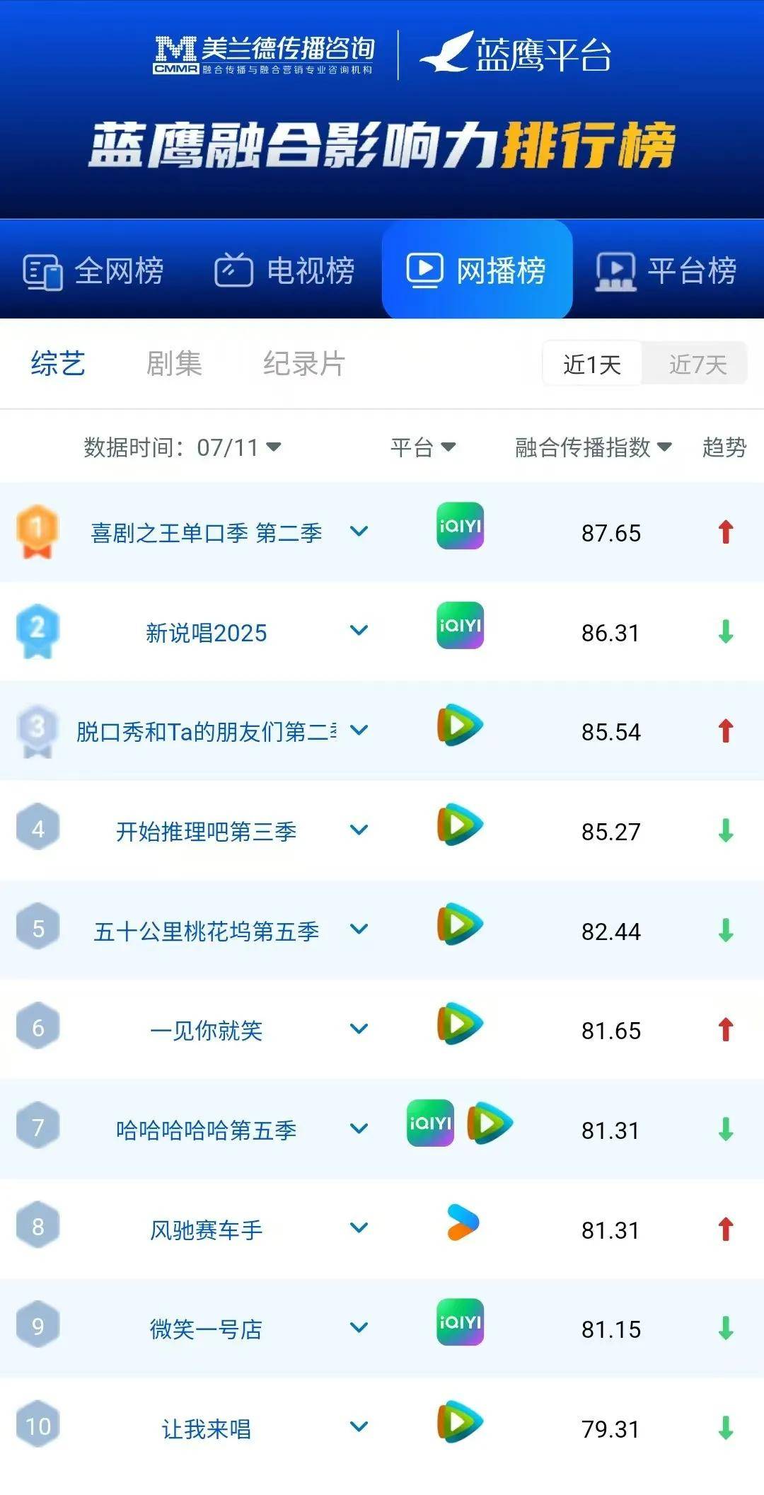 蓝鹰融合传播指数涵盖对频道、节目、品牌全网曝光、全民热议、大众口碑、长视频传播及短视频平台热度、全平台融媒体账号传播热度等多个维度的综合计算评估,用以客观反映频道、节目、企业品牌在互联网多渠道融合传播的效果及受众评价,客观反映媒体平台、节目IP、企业品牌在互联网络的融合传播影响力。