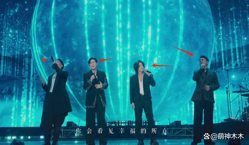 更令人疑惑的是,后续在五月天和F4合唱《笑忘歌》时,言承旭几乎全程背对朱孝天,话筒的手还挡在两人中间。歌曲高潮部分,阿信想让F4站得更近一点便于走位,但朱孝天提前走了几步,没有跟上,导致画面变成了:朱孝天“独立”站在一边,而言承旭带着吴建豪和周渝民组成一队,朱孝天仿佛“加入”了五月天的阵营。