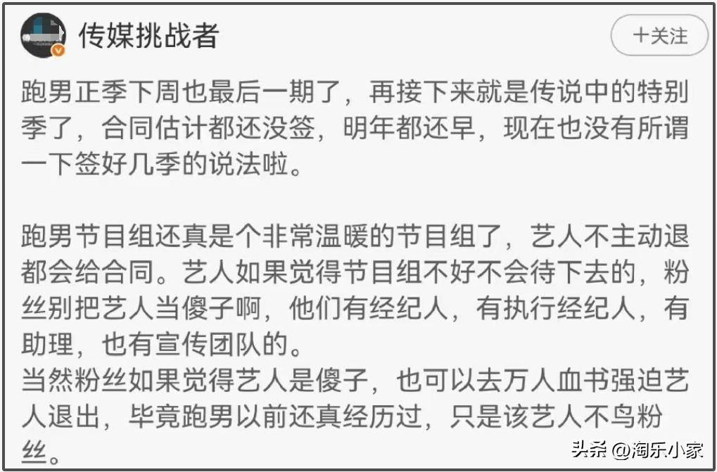这下热闹了!路人直接杀到周深评论区刷屏劝退:“哥,求放过《跑男》也放过自己!” 更有“业内懂王”放风:下季合同还没影儿呢!节目组不差你这一个,想走随时恭送!粉丝不是心疼哥哥吗?赶紧搞个“万人血书”求解约啊!成全你们!