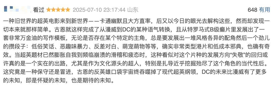 超人的成长,超人与女友和父母的互动戏份不多,但情感浓度并没有削弱,超人最后观看自己从小到大的视频剪辑是一种“偷懒”但又颇能打动人的起源故事补丁,短小精悍的情感表达也是导演前作《银河护卫队》系列的亮点。