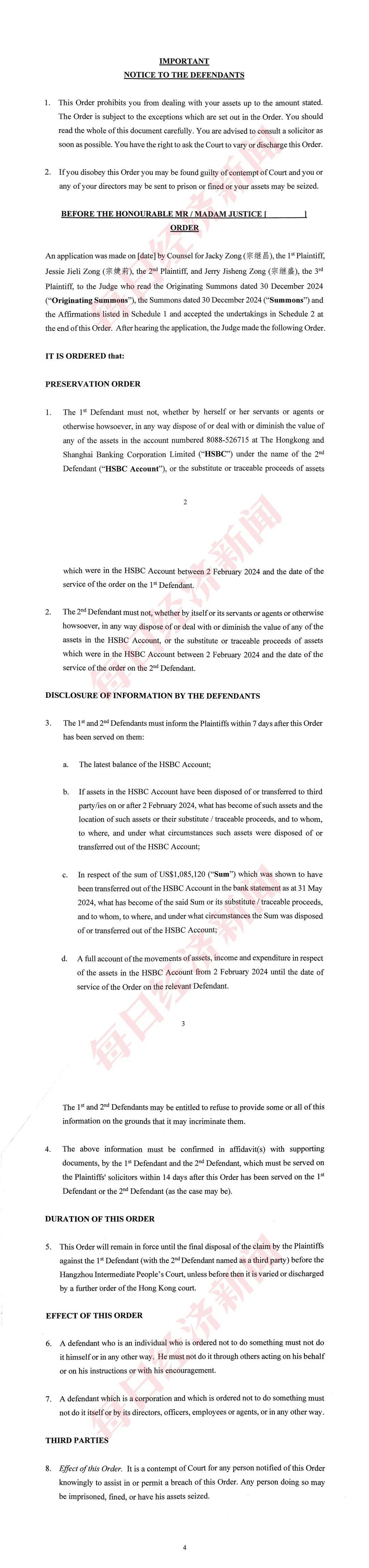 该文书显示,2024年12月,宗继昌、宗婕莉、宗继盛三人向香港高院申请针对宗馥莉的临时禁令,以阻止她处置、处理或减少在汇丰银行以建昊企业有限公司名义开立账户的资产价值。法院在审阅原诉传票(注:originating summons,香港民事诉讼的一种启动方式)、原告方及律师确认书、原告承诺书等证据资料后,向两名被告发出了临时禁止令。
