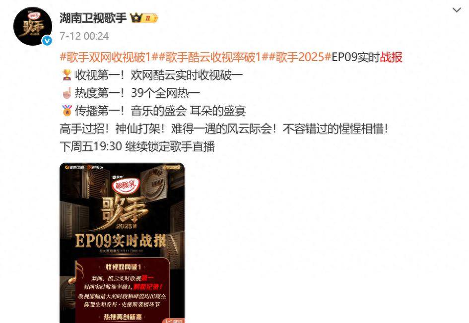 在这个夏季,综艺节目《歌手2025》以其惊人的表现和影响力强势登顶,成为“顶级综艺王座”的象征。自节目上线以来,点播数据一路攀升,首日收视率连续9期突破一亿,创下了新的纪录。收视率更是遥遥领先,屡次刷新自身佳绩。来自不同肤色和语言的顶级歌者齐聚舞台,他们的音乐感动了全球亿万观众。《歌手2025》向世界展示了卓越的顶级音乐综艺应具有的感染力、影响力与文化交融的完美结合。