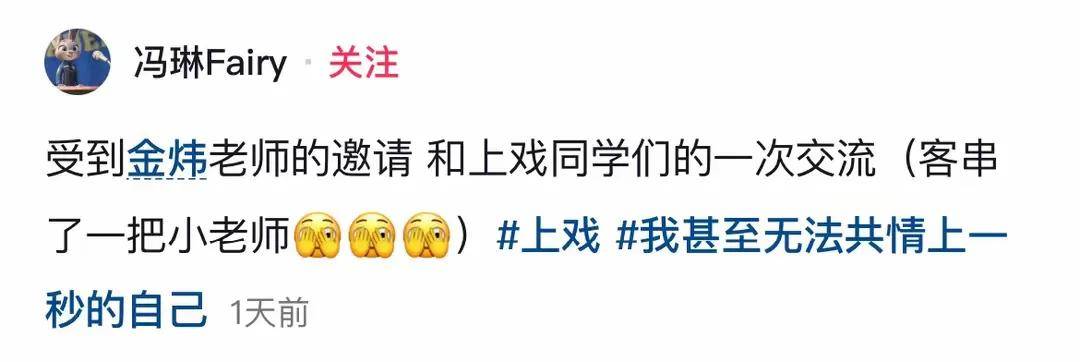 别看冯琳才毕业一年,她的履历非常丰富,此前她便受复旦师哥金炜的邀请,去了上海戏剧学院给同学们客串了一把小老师。