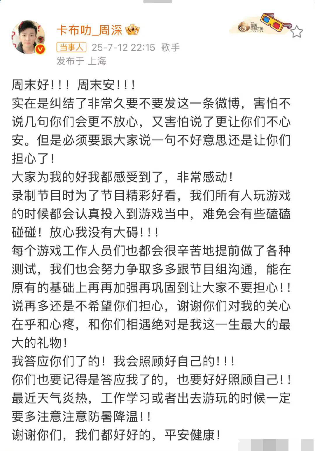 得知事故引起如此大的反响后,周深也在社交媒体上发声。他感谢大家的关心,并表示:“会好好休息,尽快恢复。”简单的一句话立刻让粉丝们松了一口气,纷纷留言表达鼓励:“周深,加油,我们一直支持你!”