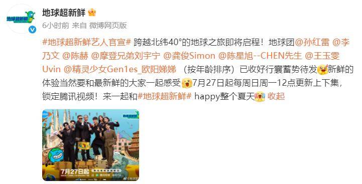 腾讯视频重磅推出的全新户外纪实真人秀《地球超新鲜》定档7月27日正式上线。凭借其强大的阵容和丰富的内容,这档节目已经引起了广泛关注。