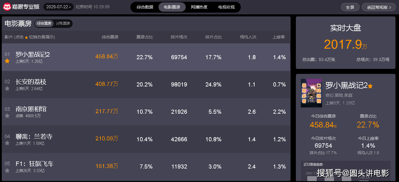 截止7月22日上午10时29分,从“猫眼专业版”实时数据显示可知,当前热映电影票房榜前五分别如下: