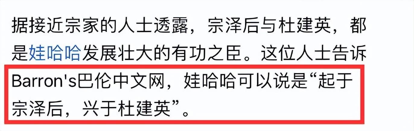 在采访中,宗泽后还表示,他和杜建英对娃哈哈来说都是功臣,接近宗家的人透露,说娃哈哈起源于宗泽后,兴于杜建英,这把宗庆后置于何地?