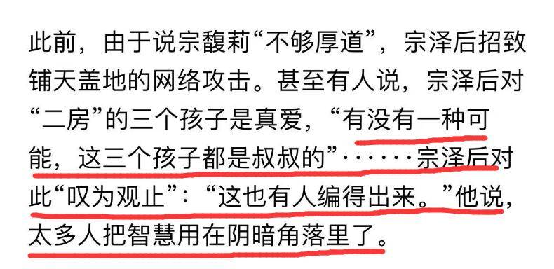 最奇怪的一点就是,宗馥莉与杜建英以及3个孩子始终没有发声,即便传出宗庆后有另外三个孩子,也都没有回应,反而是宗泽后实锤了哥哥有另外3个孩子,直接爆料哥哥的隐私,这正常吗?
