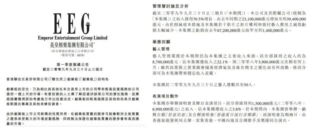 英皇娱乐2009年的一季度业绩公告显示,集团主要收入为艺人管理业务,收入870万港元,占了集团总收入22%。虽然亏损大幅收窄,但英皇娱乐仍然亏了140万港币,2008年同期亏了6720万港币。